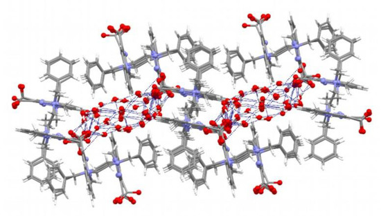 The structure of ethylenediamine derivative 8b has been confirmed by single crystal X-ray analysis (Figure 4 and Figure 5). The symmetrical internal quaternary salt 8b crystallizes as a pentahydrate. The asymmetric part of the unit cell consists of two halves of 8b occupying special positions of Ci symmetry, two molecules of 8b adopting a non-crystallographic Ci-symmetric conformation and located in general positions and 15 water molecules. The -CH2-N-CH2-CH2-N-CH2- fragment of all molecules is fully extended. In crystal, π-π stacking interactions between the quinoline systems of 8b organize the molecules into two symmetry independent columns along the [11-1] direction. The water molecules forming a 1D assembly via O-H·O hydrogen bond along [11-1] occupy a channel formed between four such columns and bind to the carboxylate groups of 8b (Figure 5). Since 1H NMR spectra of compounds 8a,b and 9 reveal single molecules, the absolute configurations at the quaternary nitrogen atoms in 8a and 9 have been assigned analogously to the meso isomer 8b, for which 2R2′S configuration has been proven by single crystal X-ray analysis. However, it cannot be ruled out that the reaction mechanisms that underlay the formation of compounds 8a and 9 are different to that of 8b, and hence, these derivatives are obtained as pure enantiomers or their racemic mixtures.