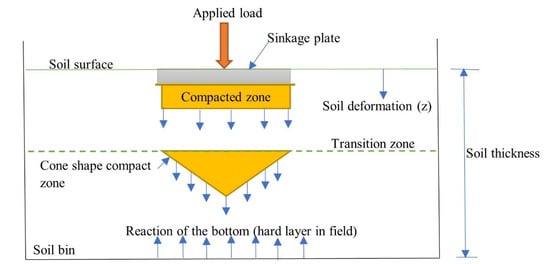 Deformation refers to compaction. The deformation in the plate sinkage test involved vertical and lateral compaction, along with soil movement under the plate [34]. There are typically two deformation zones in the field. The first is the build-up zone that has an increasing resistance, and the second is the stationary zone with constant resistance. To identify the soil density distribution in the deeper layers of sandy loam soil, Pillinger [33] used the cone penetrometer in a field. Pillinger also specified the two deformation zones and explained them in another study’s results [24]. The pressure in the build-up zone can elevate to severe relative depth (zo/d). In the stationary zone, the pressure remains constant to an extent. The plat sinkage test can help observe this phenomenon. Figure 2 illustrates a plate sinkage test’s schematic diagram. Once loading begins in the build-up zone, soil aggregates and particles rearrange while air becomes expelled, which increases the density of the dry bulk. Thus, sinkage mainly results from compaction below the plate. If the plate keeps sinking and the load is increased, then the soil immediately under the plate can no longer compact at the critical relative depth. Because of this, a conical mass is developed that moves by the plate and leads to lateral deformation and compaction; that is, sinkage is largely caused by soil becoming laterally displaced [34]. According to Sitkei et al. [24], however, if a hard layer is present at a certain depth under the footing (circular or rectangular), it can have a substantial effect on the pressure distribution, as well as the load-bearing capacity, of the soil. The hard layer mainly alters the soil’s pressure distribution because the pressure is 60% greater compared to that in a homogeneous half-space. As a result, the interaction of the compact zone with the effect of a rigid layer increases compaction and pressure. Moreover, this pressure distribution can be altered as a function of relative depth. Figure 3 presents the assessment of Pillinger’s measurements, where the critical relative depth as the soil density function was plotted. Their zo/d measured 2–7 cm in depth. This value is based on the soil density and moisture content. As can be seen from Figure 3, the critical relative depth (zo/d) strongly decreases at high moisture content levels, as the soil tends to exhibit plastic flow behavior. Hence, the experiments conducted in this study considered moisture content levels between 7% and 9%. This study primarily aimed to determine the critical relative sinkage (zo/D), called the breaking point, by assessing the plate sinkage test’s characteristics.