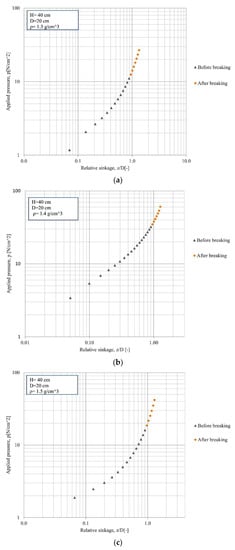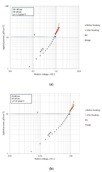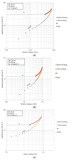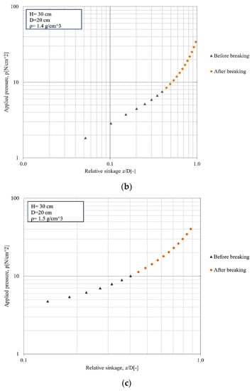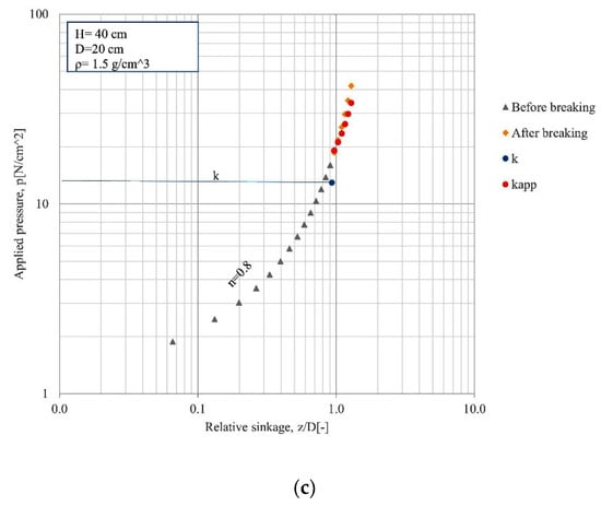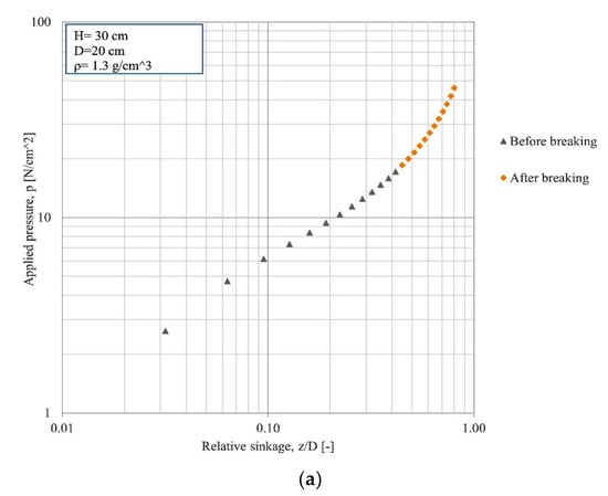 Figure 4 and Figure 5 present the results of pressure–sinkage on a logarithmic scale for 30 and 40 cm soil thickness levels, respectively, considering a 20 cm sinkage plate diameter. The measurements were carried out at three initial bulk densities (ρ) of 1.3, 1.4, and 1.5 g/cm3. The curves clearly exhibited the transition zone before and after the breaking point for the plate sinkage test. As shown in the figures, the pressure–sinkage curves include two parts. The first part is prior to the breaking point that conveys the build-up zone. In this part of the curve, the plate acts upon a homogenous soil, where the effect of the hard layer does not exist and the increasing soil strength is not yet significant. The soil deformation increases constantly, and the soil under the plate behaves similarly to when it is in the infinite thickness (without a hard layer or a specific depth). The pressure continuously intensifies with the relative sinkage, and the relationship between them is almost linear. The second part is following the breaking point that indicates the compaction zone or the zone of the soil bin bottom (the hard layer in a field) effect. Here, the compaction, as well as the deformation, increases rapidly. Further, above the rigid layer, the pressure almost does not decrease, because this layer modifies the pressure distribution in the soil body. This extended portion from the transition zone to the specific depth has a varied load-bearing capacity.