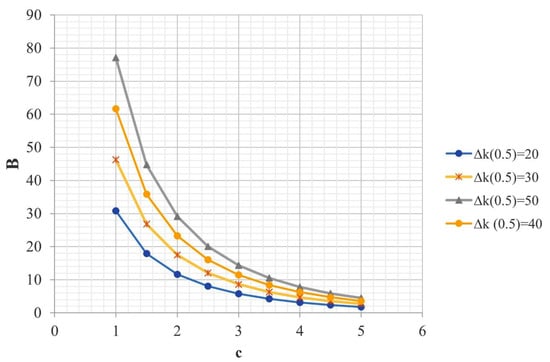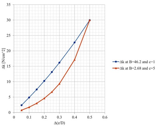Figure 6 presents a model of the relationship between ∆k and ∆(z/D) that was suggested after several calculations of Equation (6) were completed to remove the calculation errors. It is seen that Equation (6) is flexible at different values of B and c, but converging values were noticed at ∆(z/D) = 0.5, where ∆k = 30 [N/cm2]. The range of B is 2–50, while the range of c is 1–5; hence, ∆(z/D) = 0.5 is regarded as a fixed point to identify the optimum range for B and c. Figure 7 shows the relationship between B and c that can help determine their range. Hence, Equation (6) was used to calculate the constant B with a ∆k range between 10 and 50 and a c range between 1 and 5. The B and c values are coherent for ∆k (0.5) of 50, 30, and 20 (N/cm2). In the present study, the optimum range for the constant B is between 10 and 20, and between 1 and 3 for constant c.
