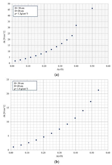 Equation (1) can be used for the first part of the pressure–sinkage curve. A power regression analysis was carried out to determine the relationship between the applied pressure (p) and the relative sinkage (zo/D) for both soil thickness levels with diverse densities, as per Equation (1). Table 3 presents the results. The data were fitted to the power model with a high coefficient of determination (R2).
