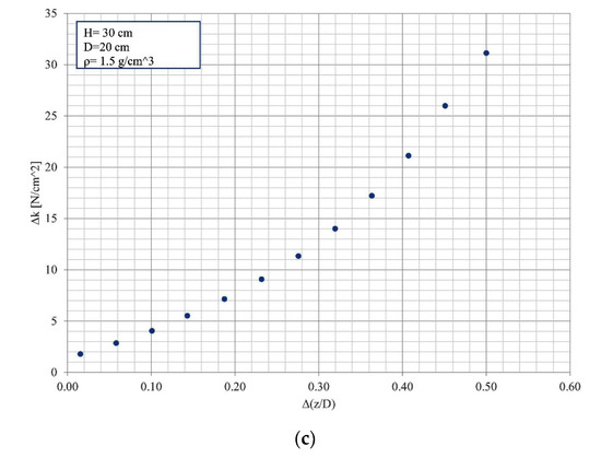 The relationship of ∆k and ∆(z/D) for a soil thickness level of 30 cm at bulk densities of (a) 1.3 g/cm3, (b) 1.4 g/cm3, and (c) 1.5 g/cm3.