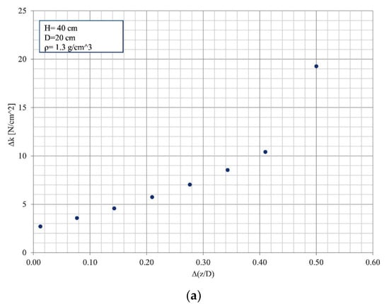 To present the relationship between ∆k and ∆(z/D), Equation (6) used the values of B and c shown in Table 5. Figure 10 and Figure 11 illustrate this relationship, along with the value of ∆k at ∆(z/D) = 0.5.