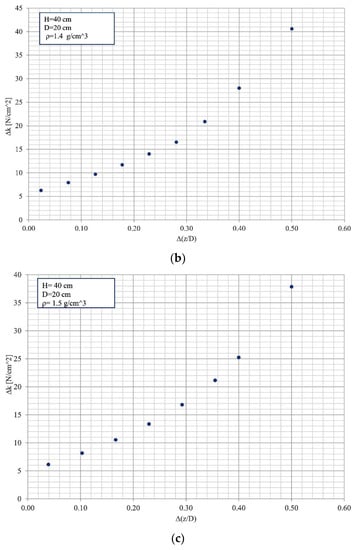 The relationship of ∆k and ∆(z/D) for a soil thickness level of 40 cm at bulk densities of (a) 1.3 g/cm3, (b) 1.4 g/cm3, and (c) 1.5 g/cm3.
