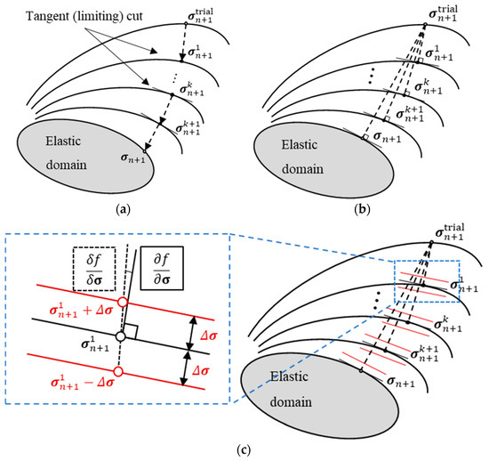 Therefore, it is noted that the stress integration in Equation (17) is used to update the equivalent plastic strain increment in Equation (18). Depending on the algorithmic treatment in the above general procedure, various algorithmic procedures have been proposed for numerically accurate and efficient integration methods.
