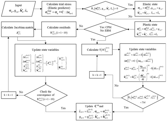 It is important to note that the previously formulated EBM—based algorithms with four residuals [55,56,58] can be retrieved if the residuals in the current formulation are properly reduced. Moreover, the numerical algorithm can be simply extended to a general stress state. The flow charts of the proposed, fully implicit EBM and CPM algorithms are shown in Figure 2.