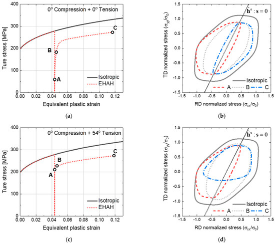 where and are the constants controlling the evolution rates of and , respectively, whereas the parameters and are introduced to determine the magnitudes of cross-hardening and softening, respectively. The initial values for the two state variables are . From Equations (11) and (12), it can be seen that no latent hardening effect is present without loading path change or for . In contrast, the yield function contracts along the cross-loading direction, even without a loading path change, and the evolution rate is maximized at the cross-loading state or for .