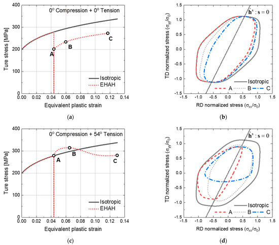 Besides the kinematic hardening or combined kinematic-distortional hardening, several anisotropic hardening models are solely based on the distortional hardening approach. Some of the distortional hardening models were developed to express the yield surface evolution by using the anisotropic coefficients as a function of the plastic work or equivalent plastic strain [33,34,35,36]. However, these models do not take into account the loading path change effect. Barlat and one the of co-authors of the present study [37,38,39] proposed a series of anisotropic hardening models without yield surface translation, which they named the homogeneous yield function based anisotropic hardening (HAH) models. The main concept of the original HAH model consists of using the distortion of the yield surface along a designated loading path, which is called a microstructure deviator, and the distortional amounts are controlled via adequately defined plastic state variables. Later, the model was extended for reproducing latent hardening, work hardening stagnation [38], as well as cross-hardening and softening under more general loading conditions [39]. This improved model was named the extended HAH model (or e-HAH, in this study). The performance of the distortional hardening models was validated through many applications, including the springback in U-draw bending and industrial S-rail forming [40,41,42,43,44,45,46]. The model is also applicable to subjects for which non-linear strain path effects are important, such as the fracture behaviors of metal after pre-deformation [47,48,49].