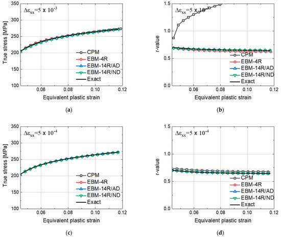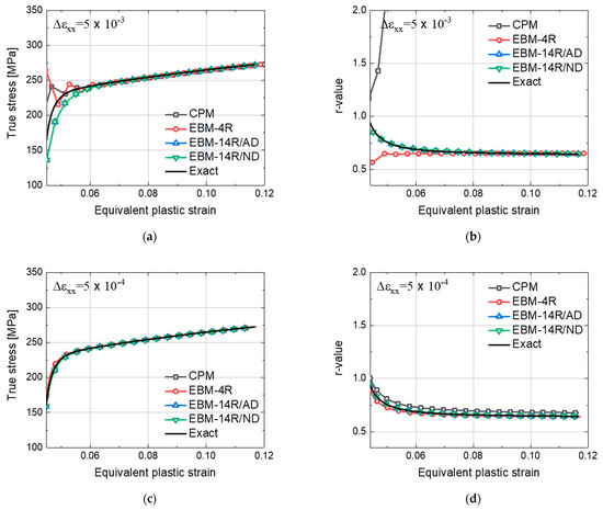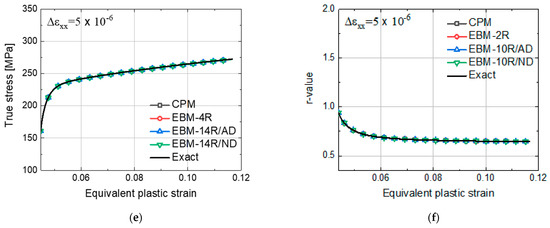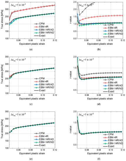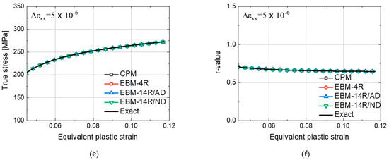 As previously mentioned, the major difficulty in this algorithmic procedure lies in the calculation of the first and second derivatives, due to the anisotropically evolving yield function. Additionally, this evolution is closely associated with a multiple number of dependent variables in the e-HAH model. To overcome this issue, Lee et al. [55] employed the multi-step Newton-Raphson method by subdividing the variables . Recently, Choi and Yoon [57] also applied the multi-stage EBM algorithm by using the sub-division of the strain increment, , which was originally proposed by Yoon et al. [61]. Furthermore, Yoon et al. [58] used a line-search method for the step size control in Equation (36) as an alternative approach to increase the algorithm stability for the distortional hardening model.