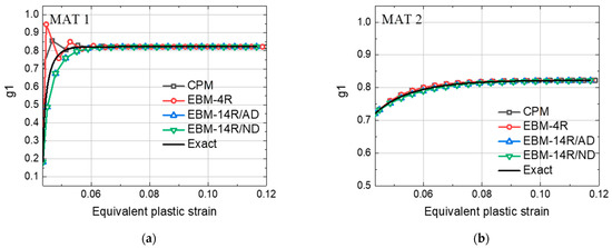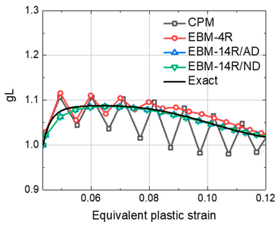 In the implicit FE formulation, an algorithmic tangent modulus is commonly required to obtain a quadratic convergence rate. However, in the conventional CPM—based stress-integration algorithm, this cannot be readily applied. For example, an additional numerical technique was proposed for the tangent moduli to preserve the quadratic convergence rate [54], but this could not be applied to the distortional hardening models. For the CPM of the HAH or e-HAH approaches presented in [55,56], the continuum tangent modulus, , was used as an alternative to the consistent tangent modulus: