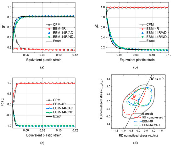 Motivated from the above issues in the FE modeling for the distortional e-HAH model, in-depth comparative studies on stress-integration algorithms were carried out in this work. For this purpose, numerical investigations on two common algorithms were considered, namely the CPM and EBM schemes. Only the plane stress condition was studied, but the overall approach can be directly extended to the general stress state. Moreover, the EBM algorithm was formulated with different numbers of residuals for updating the state variables: EBM with 4 residuals (EBM-4R) and EBM with 14 residuals (EBM-14R). The EBM-4R algorithm includes residuals for three stress components and an equivalent plastic strain, whereas the EBM-14R algorithm uses additional 10 residuals for three microstructure deviator components and seven state variables on the yield function distortions. In order to study the algorithm effect for calculating the derivatives of the evolving yield surface, two different methods for updating the yield surface gradients were then considered for the EBM-14R algorithm: analytically derived derivatives (EBM-14R/AD) and numerical derivatives based on finite difference (EBM-14R/ND). Note that only the analytical derivatives were used for the EBM-4R algorithm. In summary, four different stress integration algorithms were comparatively studied, i.e., CPM, EBM-4R, EBM-14R/AD, and EBM-14R/ND. In Figure 1, a schematic interpretation of the four different algorithms is presented. In Figure 1c, it can be seen that the directions normal to the yield surface are not identical between the EBM algorithms with analytical and numerical derivatives. This is a consequence of the truncation error that takes place from the finite difference used for the numerical derivatives. The detailed derivations for the analytical and numerical derivatives of the e-HAH model are presented in Appendix A and Appendix B.