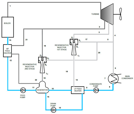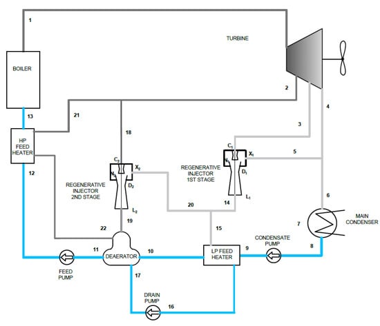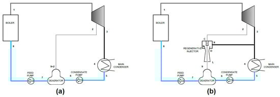 Thermal flow diagram of the proposed model: (a) Clausius–Rankine cycle with a regenerative heater (deaerator) feed from steam bleed; (b) Clausius–Rankine cycle with a regenerative heater (deaerator) feed by regenerative injector. Reproduced with permission from the MAPE Conference Organizing Team, published by New Trends in Production Engineering 2018.