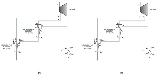 In conclusion of previous research, a mathematical model of the regenerative steam jet injector was presented [1,2,4] as a solution for the useful utilization of exhaust steam for turbines. The proposed suggestion assumed the use of steam jet injectors for mixing fluxes of low-pressure exhaust steam with bleed steam from the main turbine used as a drive medium for the injectors. In previous research, only one stage units were considered (Figure 1b).