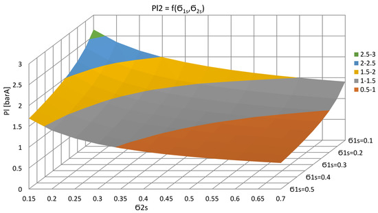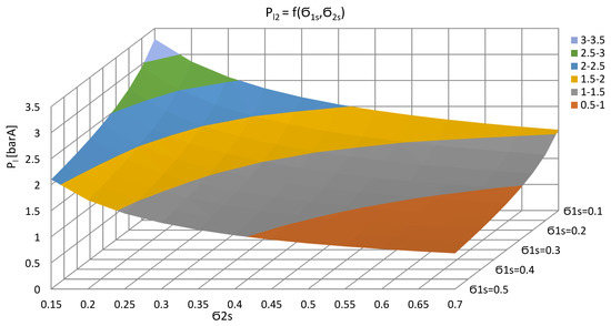 In Figure 6 and Figure 7, the relations of the possible-to-obtain steam pressures on the outlet from a two-stage injector unit is presented for both injectors driven by 6.6 barA and 6.6 and 10 barA, respectively. For the first variant, using the ejection ratio from the range of 0.143–0.667, it is possible to obtain steam with a pressure of 2.89 barA and a temperature of 231.6 °C. When driven by bleed steam pressure of 6.6 and 10 barA, the outlet steam pressure of 3.57 barA and a temperature of 268 °C can be obtained.