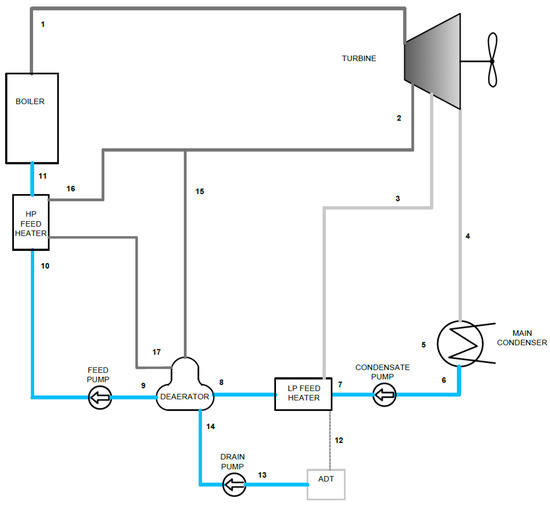 Figure 8 shows a thermal flow diagram of the reference system, modelled using the operating parameters of the turbine drive system of an LNG tanker from 2003. The regenerative feed water heating system consists of three heat exchangers (LP (Low Pressure) Feed water, deaerator, and HP (High Pressure) feed water heater) fed from two steam bleeds of the main propulsion turbine. The parameters of the working medium condition in the control planes are presented in Table 3.
