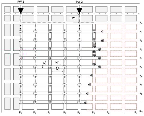 where Sf—width of the technological pillar [m], Df—length of the technological pillar [m], Sch—width of the drift [m], i—number of corridors, and j—number of crosscuts. By q the distance [m] between the discharge point and the beginning of the exploitation field is marked, resulting from the fact that the field of exploitation is contoured with a bundle of drifts in which the belt conveyor is placed.