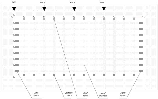 It was taken into account that the point of loading the winning is always at the closest intersection of the corridor and the crosscut as space is needed for the loader to manoeuvre while collecting the product into the bucket (the product is scattered after the wall blasting) and for loading onto the haul truck. The loader cannot turn around in a tight excavation; to load HT the LHD loader must reverse to the nearest intersection. In the case of the winning haulage with the use of loaders only, minor movements of the loader while scooping the material onto a bucket have been omitted. Hence, both cases—the haulage of the output with the use of loaders and the sets of a loader plus haul trucks—have been described in a standardized manner. Then, using n, ng, nd, nl, np the number of journeys for the winning and with it, between the discharge point PW and the loading point PZ, from individual types of chambers have been marked. For the calculation of the volume of the excavation sites made during the cross-cutting stage, for the entire field of exploitation, chambers in the shape of a “cross” were proposed. Additionally, it turned out to be necessary to describe the space remaining at the boundaries of the field with the following nomenclature: “bottom” and “top”, “left” and “right”. In addition, these spaces are characterized by the common name “the remainder”. The proposed shapes of chambers and additional spaces, when summed up, make it possible to describe the total volume of workings at the cross-cutting stage, which was the main idea of such a division, details are shown in Figure 4.