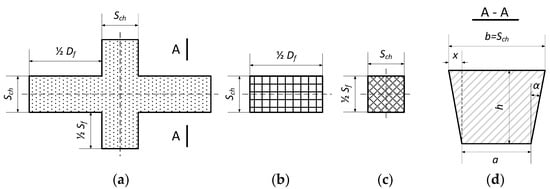 Geometric figures describing the volume of the excavation for the entire field of exploitation during the cross-cutting stage, along with a cross-section: (a) “cross”; (b) “right” and “left”; (c) “top” and “bottom”; (d) trapezoidal excavation [24].