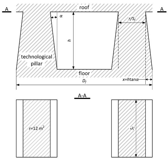 The dimensions of the technological pillar with the undercut marked; there will be two remaining pillars with the cross-section area r = 12 m2 under the roof [24].