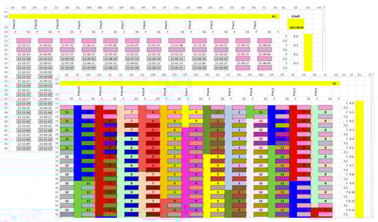 The designated work schedule for the analyzed mining field covers separately cross-cutting and retreating stages. The commencement date of works for the cross-cutting and retreating stages should be specified, necessarily taking into account the weekdays and so-called “Black Saturdays”. Only the shifts during which mining is conducted are taken into account. To plan the progress of works for the mining field, it is necessary to remember about the necessity to plan the level of extraction for the entire period in which the analyzed field is intended to be exploited. For further calculation steps, the daily output from the so-called volumetric changes is evenly divided between the cross-cutting and retreating. Determining the planned amount of output between shifts makes it possible to divide the daily production, e.g., on Saturday, 30% of the daily extraction is performed on the first shift, 70% on the second, shifts 3 and 4 do not carry out mining works. To take into account the sequence of works carried out for the cross-cutting stage, and thus to reproduce the behaviour of the wings of the extraction front, the order of operations is defined manually by assigning consecutive numbers until all intersections of the drifts in the exploitation field are described. Then, the planned sequence of retreating of individual pillars, remaining after the cross-cutting stage, is also introduced. The result of the calculations performed in the schedule will be not only the designation of the end of operation date for the cross-cutting and retreating stage (Figure 7) but also the assignment of the means of transport with the highest value of the objective function for each shift, until the completion of mining works.