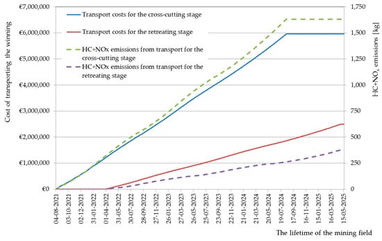 A slight fluctuation in the rate of increase in the total costs of transporting the excavated material and the amount of HC+NOx emissions during the exploitation of the mining field, shown in Figure 8, results from the increase in the distance between the mine faces and discharge points as the extraction front line moves. At the moment of launching the next discharge point, the distance for which the winning is transported gets reduced, thus the rate of increase in costs and the amount of HC+NOx emissions decreases. Then, the distance begins to increase again, together with moving away from the discharge point. The costs of transporting the excavated material are limited by the mechanism of selecting the least expensive means of transport; the obtained results are shown in Figure 9.