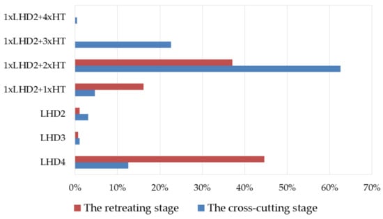 For the cross-cutting stage, the most frequently chosen means of transport is the set of 1×LHD2 + 2×HT (62%) and LHD4 (12%), while during the retreating stage these proportions change: LHD4 (45%) and 1×LHD2 + 2×HT (37%). Other types of means of transport are chosen much less frequently. The crucial difference between these two stages while selecting the means of transport is the smaller amount of the winning to be obtained from the pillars at the retreating stage.