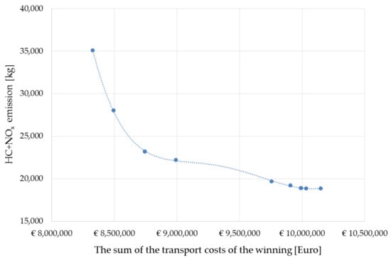 The obtained dependence shows that a 20% reduction of HC+NOx emission is possible using the proposed method of selecting the means of transport, with a 2% increase in the cost of the winning transport. The nature of the dependence is similar to the well-known Pareto principle, although an 80% reduction of emissions turned out to be impossible to achieve, regardless of the costs of transporting the output.