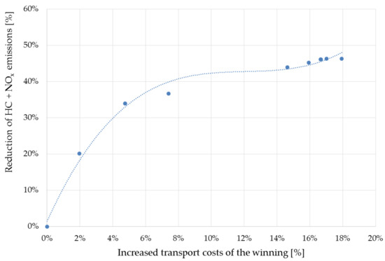 It is not surprising that the highest level of HC+NOx emission was recorded with the minimum cost of the winning transport during the exploitation of the mining field. It is interesting, however, that it is possible to significantly reduce the level of HC+NOx emissions (from 35,110 to 18,860 kg over more than 3 years of operation) by the skilful selection of the type of means of transport, even if all loaders and haul trucks meet the same Stage II standard. The potential of a possible reduction of HC+NOx emissions is better illustrated by the presentation of percentage values—Figure 11.