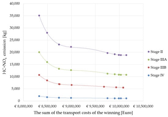 For the loader plus haulage vehicles, Formula (12) was used, for each of the machines that make up the set, the emissions from different types of means of transport were summed up. It was assumed that the means of transport the least harmful for the environment is a loader or a set of loader and haulage vehicles with the lowest HC+NOx emission, according to the formula:
