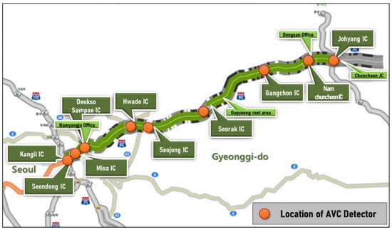 A total of nine detectors were installed along a 61.4 km section of the Seoul–Chuncheon Expressway. Two types of detectors were installed: a vehicle detector equipped with a double-loop detector that collects traffic flow data such as traffic volume, speed, and occupancy; and an AVC detector equipped with piezosensors that are capable of classifying 12 types of vehicles (see Figure 2 for example).
