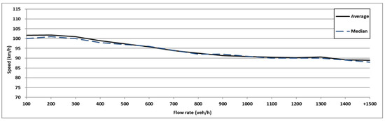 The following plot shows the mean and median speeds altered by the traffic flow in which heavy vehicles are included in the same ratio. Figure 4 shows the changes in the mean and median speeds according to the traffic volume in a traffic flow with only small-sized vehicles. Figure 5, Figure 6 and Figure 7 show the speed changes in the traffic flow where the proportion of heavy vehicles is increased to 15%, 30%, and 50%, respectively. As shown in Figure 4, in the traffic flow that did not include heavy vehicles, the decrease in speed follows an almost constant slope. This is a downward slope similar to the one commonly seen in a typical traffic-speed graph. When the traffic flow rate in Figure 4 increases from 0 veh/h to 500 veh/h, it shows a very steep slope even though it is a section generally expected to have a small decrease in speed due to low traffic. This can be interpreted as a phenomenon that occurs due to the gradually decreasing proportion of vehicles that drive too fast as they ignore the speed limit of 100 km/h. Although these characteristics go against the road regulations, they are shown here as these are the actual data obtained.