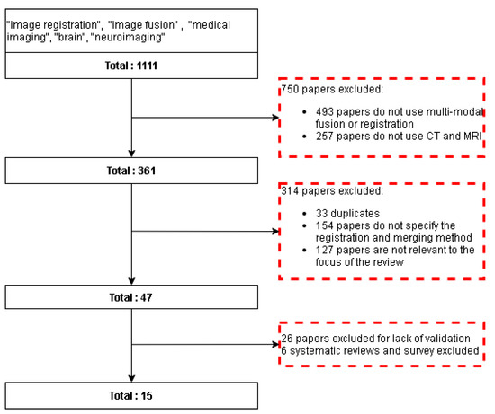 The databases and search engines of Scopus, IEEE, PubMed, Springer, and Google Scholar were useful to conduct the review, because they include articles from the medical and engineering area. The following keywords were used to select articles about multi-modal brain image fusion: “image registration”, “image fusion”, “medical imaging”, “brain”, “neuroimaging”, “computer tomography”, “CT”, “magnetic resonance imaging”, and “MRI”. The dates of the selected articles were between January 2010 and April 2021, obtaining a total of 1111 papers in the first stage. Afterwards, the following inclusion criteria were used: (i) studies about multi-modal image fusion or registration; (ii) studies that used brain images; and (iii) studies that specified the registration and merging method. This stage resulted in a total of 361 papers. Finally, two exclusion criteria were used: (i) studies without validation of the procedure; and (ii) studies that did not use CT or MRI. The final stage returned a total of 15 papers (Table 2 and Figure 2).
