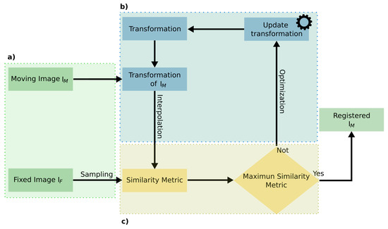 Image registration consists of finding a transformation T such that it aligns a moving image with a fixed image , by minimizing a cost function C, where the vector contains the parameters for the transform (Equation (1)) [31,32].
