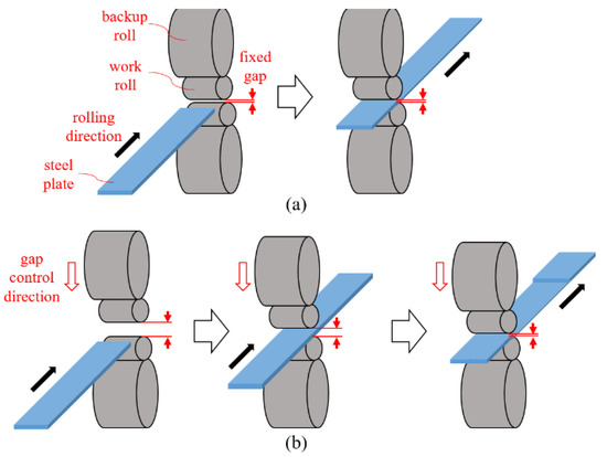 In the traditional hot rolling process, the gap between the upper and lower rollers is fixed [19] as the steel plate passes through the rollers. To roll the plate, the gap between the two rollers must be smaller than the thickness of the steel plate. Consequently, the steel plate may be damaged owing to the generated large frictional force. This force is called impact drop and is one of the main causes of coil defects.