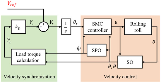 Figure 2 shows a system in which a motor is attached to the roller to synchronize the velocity of the rollers and steel plate. To reduce the frictional force generated when the steel plate and roller come into contact, the rotational velocity of the roller () and transfer velocity of the steel plate () must be synchronized, as shown in Figure 2. To achieve this, the velocities of the rollers and steel plate must be accurately measured. However, because of the harsh hot rolling process environment, attaching velocity sensors to the steel plate is challenging. Accordingly, instead of directly measuring the rotational and transfer velocities of the roller and steel plate, respectively, an indirect method of synchronizing these velocities is proposed.