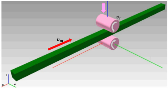 The flying touch method controls the gap between the two rollers to enable the smooth rolling of the steel plate, thus reducing the impact drop. A simple concept of the flying touch method is shown in Figure 1. In the traditional hot rolling process shown in Figure 1a, the steel plate must pass through the gap between two fixed rollers. However, in the hot rolling system based on the flying touch method shown in Figure 1b, the gap between the rollers is set to be sufficiently large to allow the plate to pass between the two rollers before rolling begins. Subsequently, when hot rolling starts, the gap between the two rollers is controlled such that the rollers can smoothly press the steel plate. The flying touch method reduces the impact drop, which can cause scratch formation, by alleviating the impact force between the steel plate and rollers. However, to implement this method, a system for operating the upper roller in a direction perpendicular to the rolling direction must be incorporated.