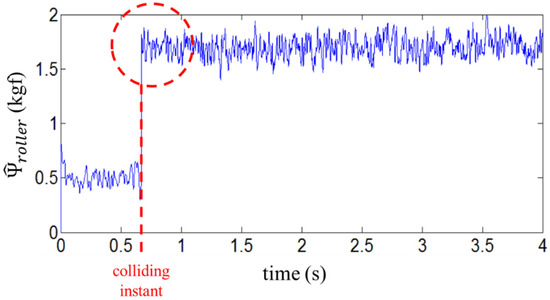 Figure 5 shows the estimated perturbation data using the SPO based on the encoder data of the motor rotating the upper roller. The roller collided with the steel plate at approximately 0.65 s after the initiation of simulation. Since the collision, a large perturbation value was consistently observed. The simulation result confirms that the assumed perturbation estimated by the SPO is the collision force disturbance between the steel plate and roller. The perturbation estimated by the SPO is used in practical experiments to minimize the friction between the roller and steel plate.