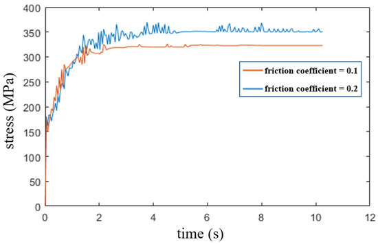 Figure 8 shows the change in the steel plate stress over time when the friction coefficients are 0.2 and 0.1. This stress is generated by the friction force resulting from the velocity difference between the upper roller and steel plate. The upper roller starts to roll the plate at the beginning of the simulation. When the friction coefficients are 0.2 and 0.1, the maximum stresses are 370.13 and 326.29 MPa, respectively; furthermore, the stress was more evenly distributed when the friction coefficient was 0.1. Consequently, the stress is greater when the roller velocity does not synchronize well with that of the steel plate, causing the formation of more scratches during the rolling process.