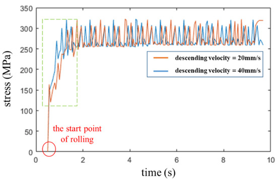 Figure 9 shows the simulation results of the change in stress when the descending velocities of the roller are constant at 20 and 40 mm/s. The simulation results indicate that, immediately after the initiation of rolling, the stress caused by the descending velocity of 40 mm/s was seemingly greater than that due to the stress caused by a descending velocity of 20 mm/s. Although the difference between the two descending speeds did not have a significant effect on the stress during the continuous rolling period after the roller collided with the steel plate, the downward motion of the roller with a low descending velocity, to the extent feasible to reduce stress at the instant of collision, was confirmed to be better.