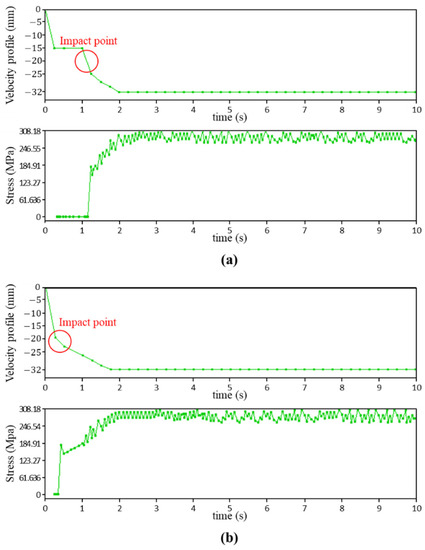 Stress distribution when roller descends according to curved velocity profile. Graphs of velocity profile of upper roller and steel plate stress when descending velocities are (a) 40 mm/s and (b) 20 mm/s at moment of impact.