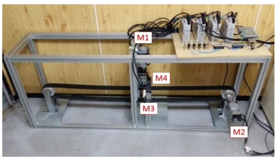 A simulator with four motors was used for the rudimentary implementation of the rolling process. Motor M1, which allows the upper roller to move up and down in a vertical direction, is an actuator that implements the flying touch method. Motor M2 continuously rotates clockwise during rolling to transport the rubber belt, allowing it to pass between the upper and lower rollers. Motors M3 and M4 rotate the upper and lower rollers, respectively. These motors were used to implement the velocity synchronization algorithm. Each motor was appropriately selected by considering the expected load during rolling. In addition, all motors in this simulator were controlled by the robust control algorithm of the SMCSPO to overcome the disturbances and nonlinearities in the rolling process. The continuous torque and rated power of the motors, the size of the simulator, and the materials are listed in Table 3. Although the simulator shape reflects that of the POSCO hot rolling system, its size is 1/40 times that of the real system.