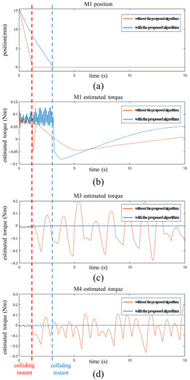 Figure 14b shows the estimated reaction torque when the M1 motor descends to the trajectory shown in Figure 14a. From the instant after collision (red line in Figure 14b), the estimated torque significantly fluctuated because the scratch reduction algorithm was not applied. When the scratch reduction algorithm was applied, the change in the estimated reaction force was relatively smooth at the moment of collision. The estimated reaction torque results of motors M3 and M4 are shown in Figure 14c,d, respectively, and summarized in Table 4. In the experiment in which the proposed algorithm was applied, the maximum torque, mean torque, and standard deviation values was considerably smaller than the experiment where the algorithm was not applied. If the reaction torque estimated by the SPO is small, the roller rotational velocity and steel plate velocity are considered well-synchronized. This means that the frictional force generated between the steel plate and rollers is reduced.