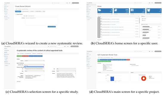 Considering the overall category features, the tool has been implemented with a role management module, thus enabling users to collaboratively work on a review. Two main roles are defined, namely performer and supervisor. SR data can be shared among all the SR team members. With a user’s consent, the SR data can be accessed through the web interface for preservation and reproducibility (see Figure 3b). Thus, users can follow other users’ activities. Finally, CloudSERA provides a logging system to trace the actions performed by users in an SR project. To summarize, CloudSERA has been thought of, and built, to cover the main features of the overall functionality category, such as collaboration, user role management, data maintenance and traceability.