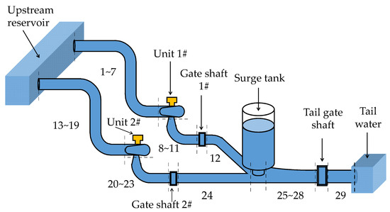The research project in this paper involved two turbines with a capacity of 1015 MW per unit. This set up consists of two parallel water diversion penstocks and tail branches, a downstream surge tank, and a D-shaped tail tunnel with a maintenance tail gate shaft located next to the tail water. Figure 1 is a sketch of the plan layout and detailed division information of the hydropower system.