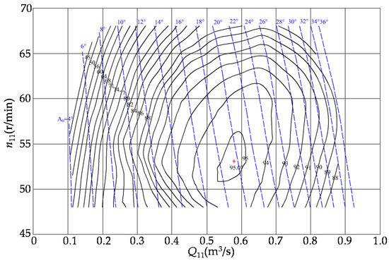 Figure 2 shows the comprehensive characteristic curves of the turbine. Here, Q11 and n11 stand for the unit discharge and unit speed, respectively, which are defined as and . From Figure 2, the optimal operating conditions for the turbine are guide vane opening a = 18.8°, unit speed n11 = 53.07 r/min, unit flow rate Q11 = 0.579 m3/s, and peak efficiency = 95.07%.
