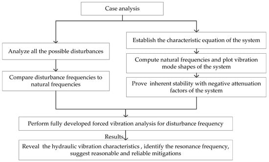 where (i = 25, 26, 27, 28, 29) is the field matrix of the pipe numbered i in the main tail tunnel, is the point matrix of the gate shaft, is the point matrix of the surge tank located at the branch, and is the field matrix of two parallel branches. The corresponding hydraulic vibration analysis process is presented in Figure 6.