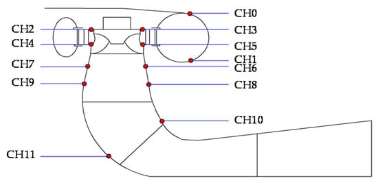 In the experiment, twelve pressure-monitoring points, designated as CH0~CH12, were evenly arranged in the flow passage as shown in Figure 7. In detail, CH0 and CH1 were located in the spiral casing, CH2~CH5 were located in the vaneless space, CH6~CH9 were located in the draft tube cone, and CH10~CH11 were located in the draft tube elbow.