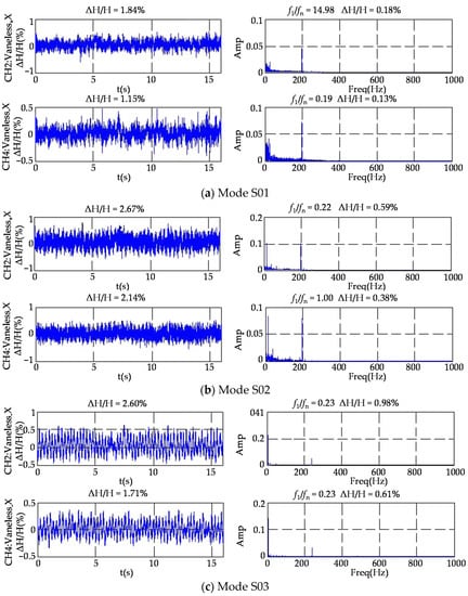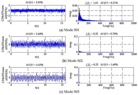 Figure 8 shows the pressure fluctuation characteristics in the vaneless space (CH2 and CH4). The time domain characteristics show that the fluctuation peak monitored under mode S02 was the largest compared to S01 and S03. The frequency domain characteristics indicate that under mode S01 with smaller guide vane openings, a blade frequency of 15fn was manifested, caused by rotor–stator interaction, and with guide vane openings increasing, the runner rotational frequency reached 1.0fn at point CH4 under S02. A frequency of 0.2fn, affected by vortex rope in the draft tube, persists in all operating modes.