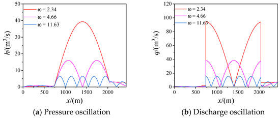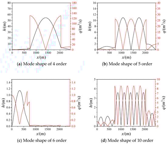 The vibration mode shapes are calculated with an assumed initial oscillatory discharge value QU = 1.0 m3/s at the upstream end. The rotational frequency of the prototype runner is fn = 1.852 Hz, and ω = 11.63 rad/s. According to the empirical formula, the estimated frequency range of vortex rope was f = (0.167~0.5) fn = 0.309~0.926 Hz, and ω = 1.94~5.82 rad/s. Based on the above analysis, only orders whose angular frequency is in the range of vortex rope frequency (4th, 5th, 6th) and close to the runner rotational frequency (10th) are selected for plotting in Figure 10, including oscillatory discharge and oscillatory pressure head, and the abscissa is the distance from the inlet, while the black line is the head and the red line is the flow rate. For frequencies approximately equal to those of the 4th, 5th, and 10th orders, a small disturbance could cause intense pressure oscillation in the tail tunnel. However, for the sixth order, there was no obvious pressure oscillation in the tail tunnel shown in Figure 10c. The mode shapes reveal the modulus of oscillatory value along the pipeline at different frequencies, and the amplitude of pressure fluctuation is at a minimum at the node and a maximum at the antinode. The locations of the node and antinode of the flow are opposite to those in the head. Since the upstream and downstream are reservoirs with a constant water level, the oscillatory head is zero at both ends and in all vibration modes.