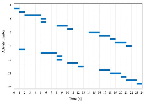 - Buddhakulsomsiri, J.; Kim, D.S. Priority Rule-Based Heuristic for Multi-Mode Resource-Constrained Project Scheduling Problems with Resource Vacations and Activity Splitting. Eur. J. Oper. Res. 2007, 178, 374–390. [Google Scholar] [CrossRef]